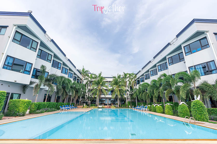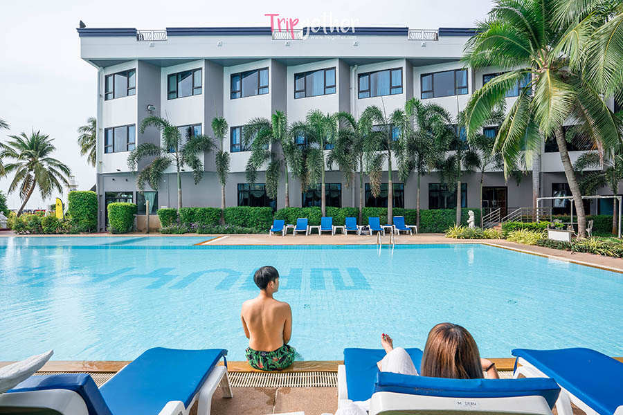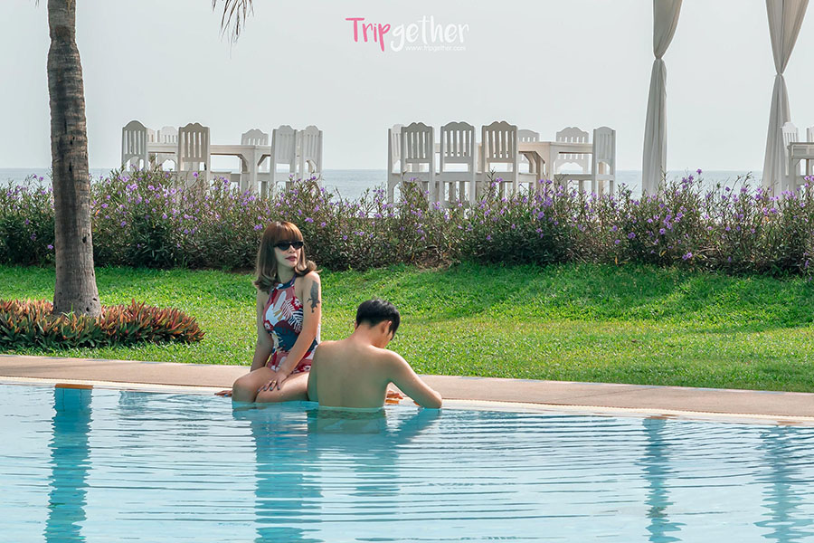 ช่วงบ่ายๆ เราก็เลยลงมาเล่นน้ำคลายร้อนกันที่สระว่ายน้ำของ นาวีภิรมย์ ซึ่งเป็นสระว่ายน้ำขนาดใหญ่ถึงแม้ว่าไม่ได้ลงเล่นน้ำทะเลแต่ก็ยังได้ฟีลลิ่งของความเป็นทะเลด้วยบรรยากาศรอบๆ สระว่ายน้ำที่เต็มไปด้วยธรรมชาติและต้นมะพร้าว รอบๆ สระว่ายน้ำยังมีเตียงอาบแดดไว้ให้นั่งชิลล์อีกด้วย หรือใครที่อยากจะอัพรูปลงเฟซบุ๊กแบบชีวิตดี๊ดีต้องมาถ่ายกันที่มุมสระว่ายน้ำนี่เลย