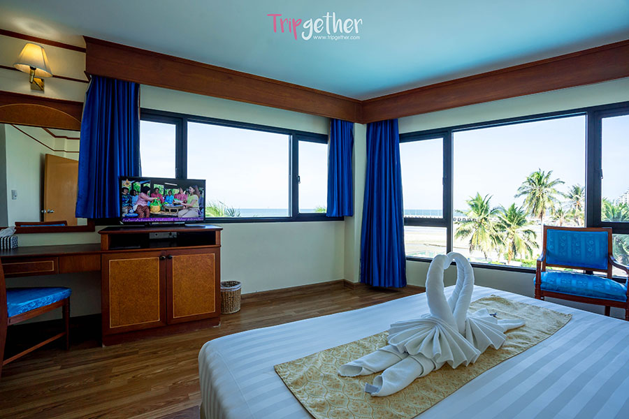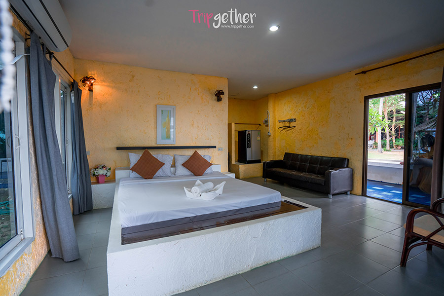 ถัดเข้ามาที่ตัวห้องนอนก็ยังตกแต่งไปด้วยสไตล์เรียบหรูที่เน้นความสะดวกสบาย เตียงขนาด King Size ยังถูกจัดวางไว้ในสเปซที่พอเหมาะทำให้สามารถมองวิวทะเลได้จากบนเตียงเลยทีเดียว เท่านั้นยังไม่พอภายในห้องยังครบครันไปด้วยสิ่งอำนวยความสะดวกมากมายแบบที่เรียกได้ว่าคุ้มค่า คุ้มราคาสุดๆ ใครที่กำลังมองหาที่พักบรรยากาศดีติดริมทะเล แถมราคาน่ารักต้องมาที่นี่เลย