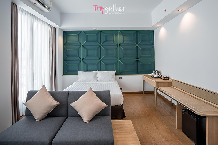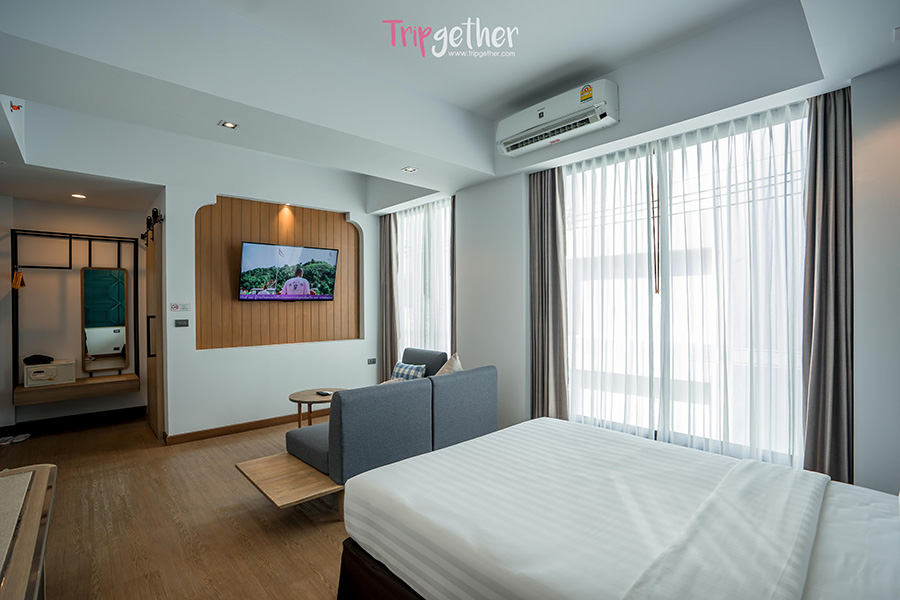 อย่างที่บอกไปว่าทริปนี้เราสองคนเน้นมาพักผ่อนแบบชิลล์ๆ เราเลยจองห้อง Premier Room ห้องที่ตกแต่งด้วยสไตล์โมเดิร์นเรียบหรู ที่ตอบโจทย์สำหรับคนที่มาพักผ่อนแบบเรามากๆ พื้นที่ภายในห้องก็ยังกว้างขวางและครบครันไปด้วยสิ่งอำนวยความสะดวกมากมาย ที่มาพร้อมกับเตียง Queen bed และโซฟานุ่มๆ พร้อมหน้าต่างบานใหญ่ไว้ให้ชมวิวกันอย่างจุใจ