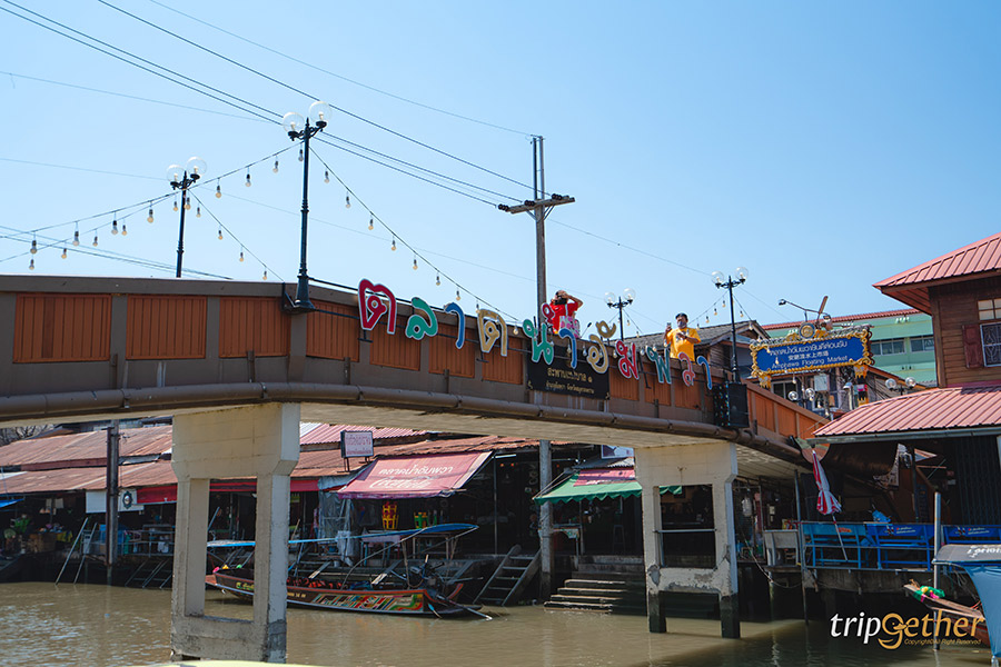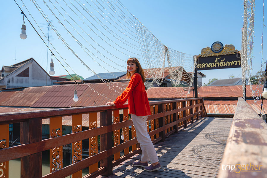 นั่งรถสองแถวจากตลาดแม่กลองมาจอดที่หน้าตลาดน้ำอัมพวา ตลาดเก่าริมน้ำที่เต็มไปด้วยกลิ่นอายความคลาสสิก โดยตลาดน้ำจะคึกคักมากสุดในวันศุกร์ เสาร์และอาทิตย์ มีร้านมากมายทั้งของกินของใช้ รวมถึงเสน่ห์ของตลาดน้ำที่จะมีของขายตามเรือต่างๆ แต่ทริปนี้บรรยากาศกลับตรงกันข้ามกับความคึกคัก เพราะเรามาเที่ยวในวันธรรมดา ดังนั้นตลาดน้ำอัมพวาจะเงียบเหงา คนไม่พลุกพล่านเหมือนกับสองตลาดที่เราไปมาก่อนหน้านี้ แต่ก็มีความชิลล์ สบายๆ ส่วนร้านในตลาดก็มีเปิดอยู่บ้าง อย่างร้านกาแฟ ร้านอาหาร ร้านของฝาก