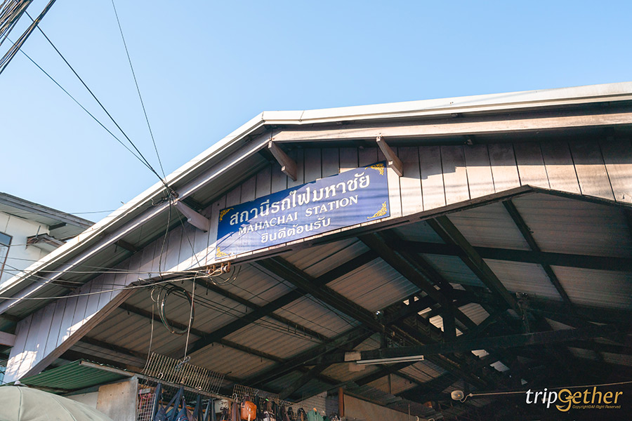 หลังจากเดินสำรวจตลาดกันเรียบร้อย ก็เตรียมเดินไปขึ้นเรือข้ามฟากไปท่าฉลอมเพื่อต่อรถไฟไปยังตลาดแม่กลองกันต่อ ก่อนอื่นเรามาตั้งต้นกันที่ป้ายสถานีมหาชัยและเดินออกไปทางตลาด ผ่านตลาดตรงนี้ของกินเยอะมาก เหมาะกับหาอะไรกินเล็กๆ น้อยๆ อีกทั้งยังมีร้านขายของฝากและของทะเลด้วย