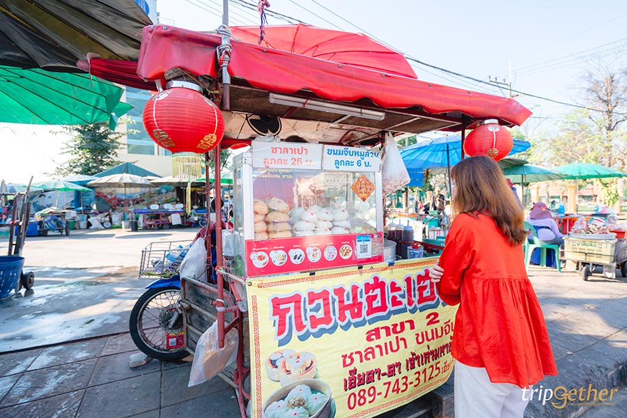 เดินมาสักพักเราก็เจอร้านรถเข็นขายซาลาเปาชิ้นโตๆ ขาวๆ เห็นแล้วอดใจไม่ไหวต้องขอแวะอีกสักร้าน ซึ่งซาลาเปาร้านนี้มีสูตรดั้งเดิมจากไหหลําและเป็นร้านเก่าแก่ของมหาชัย มีขายทั้งซาลาเปา หมั่นโถ และขนมจีบหมู ส่วนใครมาก็แนะนำว่าต้องสั่งซาลาเปาไส้หมูสับไข่เค็มและหมั่นโถ ความพิเศษของร้านนี้ก็คือทางร้านจะมีน้ำผึ้งแถมมาให้กินคู่กับหมั่นโถ บอกเลยว่าเป็นความแปลกใหม่ที่เข้ากันสุดๆ ใครที่อยากลองชิมก็ตามมาได้เลย ร้านเปิดขายทุกวันและพิกัดอยู่หน้าท่าเรือข้ามฟากมหาชัย