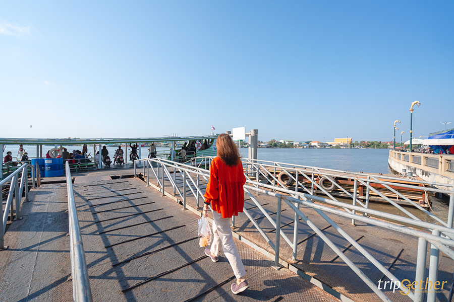 เดินจากสถานีรถไฟมหาชัยมาแป๊บเดียว ระยะทางประมาณ 500 เมตรก็มาถึงท่าเรือข้ามฟากแล้ว โดยท่าเรือนี้มีจะเรือมาจอดตลอดและเปิดบริการ 24 ชั่วโมง มาถึงก็จ่ายเงินข้ามฟากคนละ 3 บาท เสร็จแล้วขึ้นไปรอบนเรือได้เลย บอกเลยว่าบนเรือมีทั้งคนและมอเตอร์ไซค์ใช้บริการเรือไม่ขาดสาย