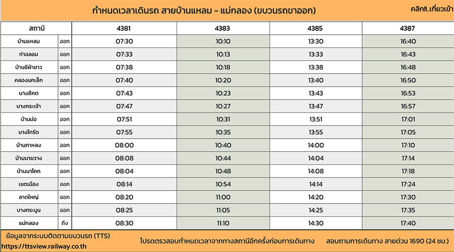 ตารางรถไฟสายบ้านแหลม – แม่กลอง มีแค่ 4 รอบเท่านั้นนะ