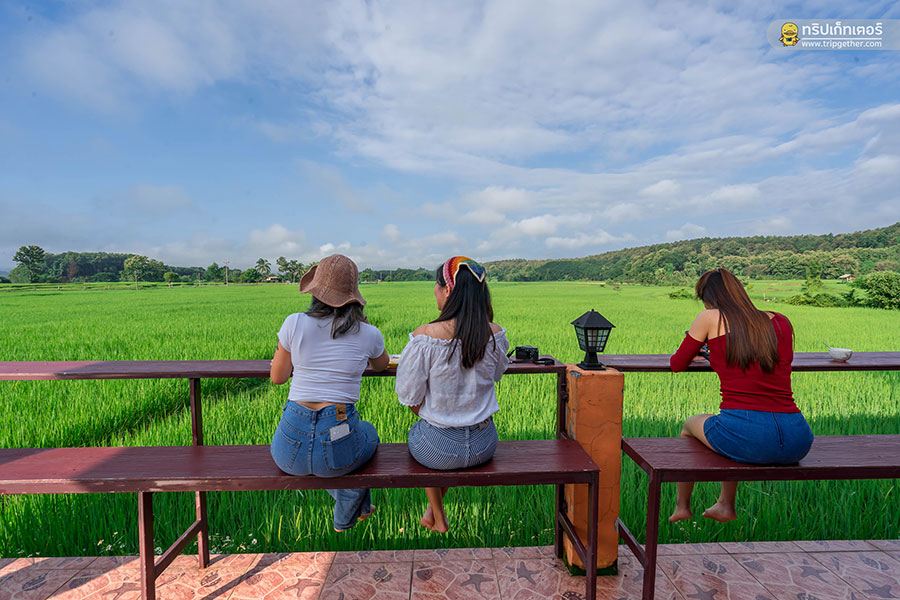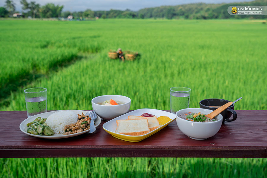 และก่อนเช็คเอ้าท์ทางโฮมสเตย์ยังได้จัดเตรียมอาหารเช้าไว้ให้รองท้องกันด้วยเป็นเมนูง่ายๆ อย่างข้าวต้มหมู ข้าวผัดกะเพรา กาแฟ โอวัลติน ปาท่องโก๋ในแบบบุฟเฟ่ให้คุณเติมได้ไม่อั้น กับมุมห้องอาหารเช้าสุดฟินให้นั่งกินข้าวพร้อมชมวิวทุ่งนาเขียวๆ