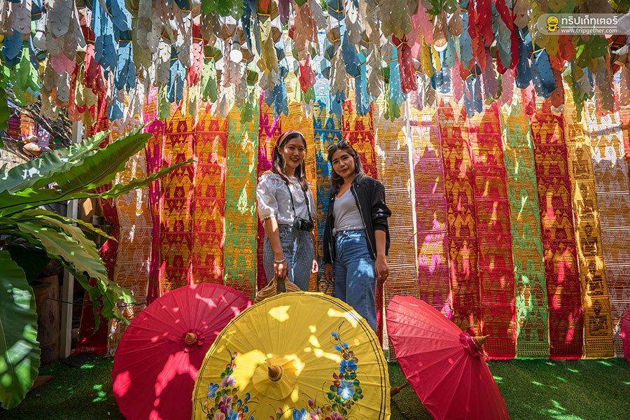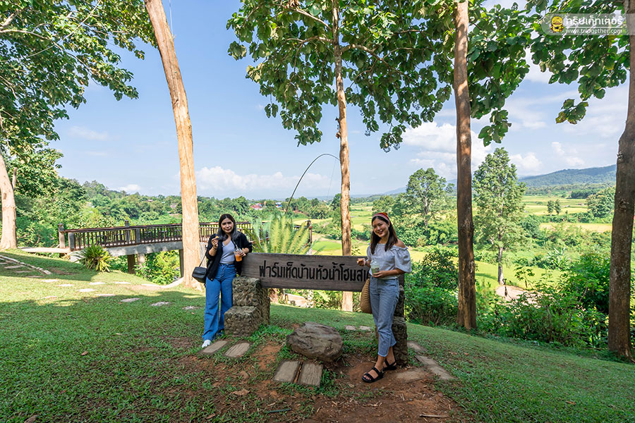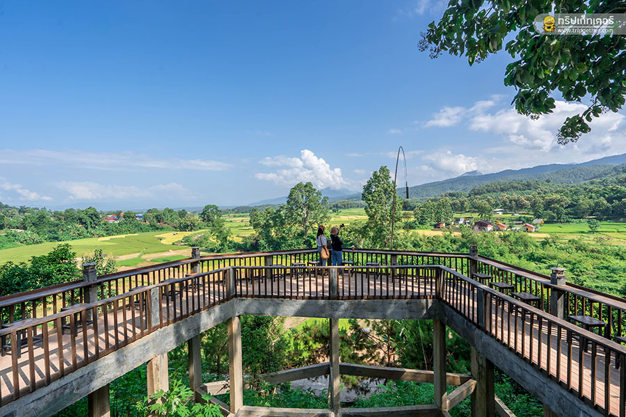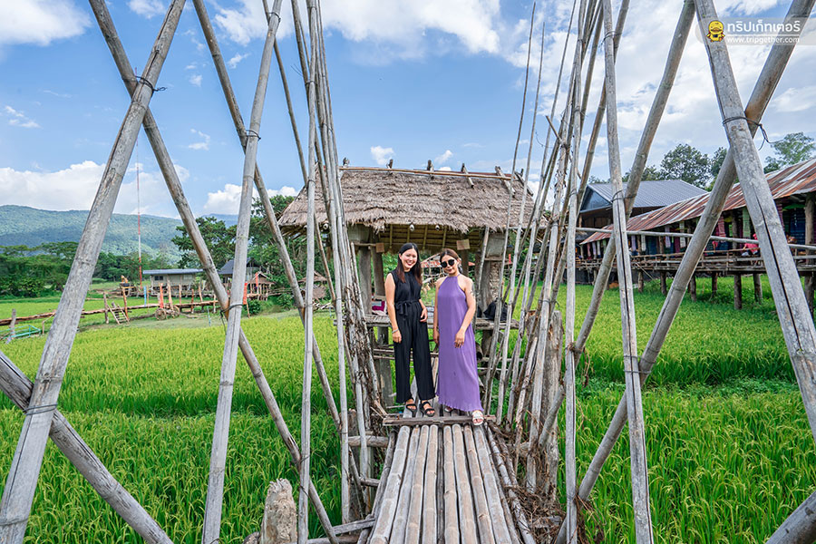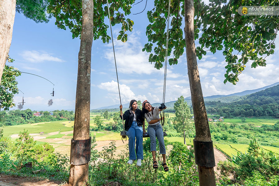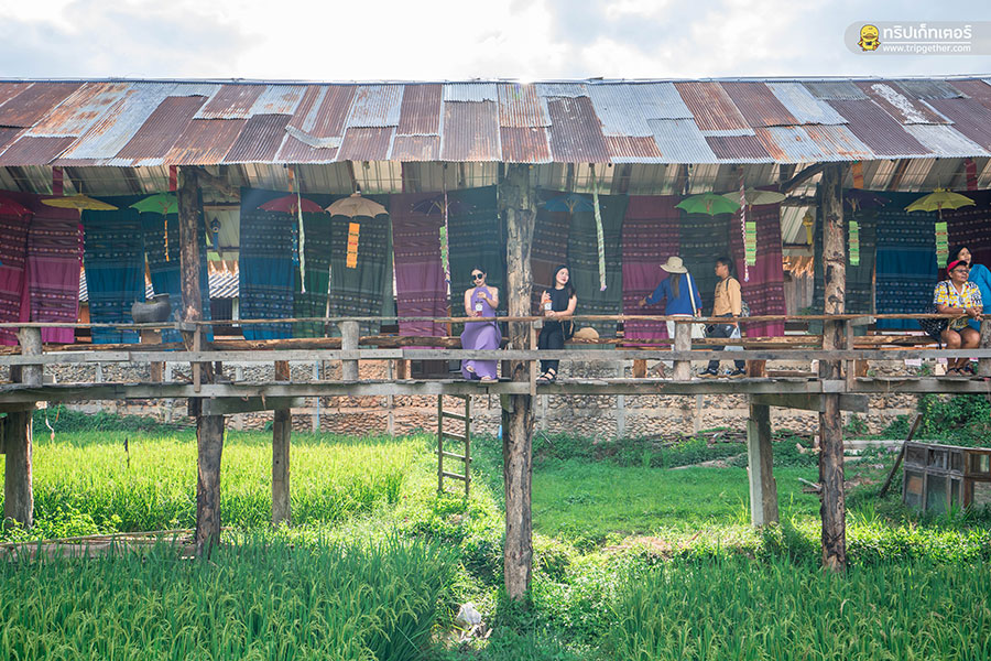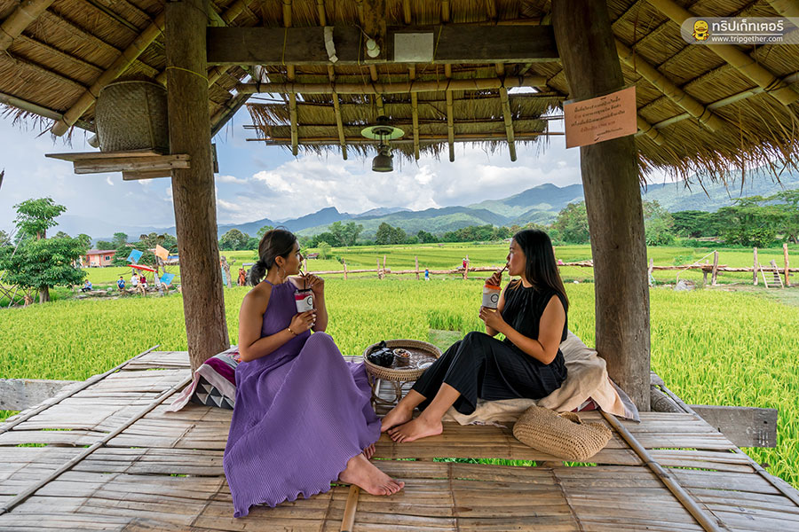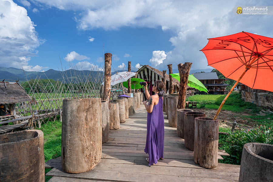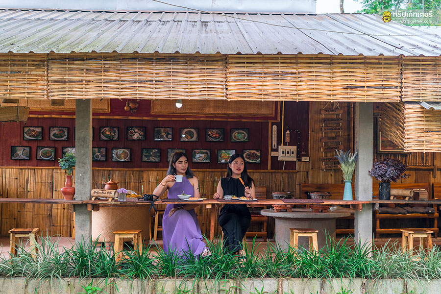 ระยะเวลาชั่วโมงนิดๆ จากบ่อเกลือ เราก็เดินทางมาถึงยัง ร้านกาแฟบ้านไทลื้อ ร้านอาหารและคาเฟ่ที่มาพร้อมกับมุมถ่ายรูปสุดชิค ไฮไลท์สะพานไม้กลางทุ่งนา ที่ถูกแขวนไปด้วยผ้าทอหลากสีสันที่กลายเป็นแลนด์มาร์คห้ามพลาดของที่นี่ และอิ่มอร่อยกับเมนูข้าวซอยไก่ ขนมจีนน้ำเงี้ยว นอกจากนี้ยังมีเบเกอรี่ พร้อมเครื่องดื่มชื่นใจอีกหลายเมนูให้สั่งกันจนล้นโต๊ะ ร้านกาแฟบ้านไทลื้อ เปิดให้บริการเวลา 07.30 – 17.00 น. โทร. 089 264 6058