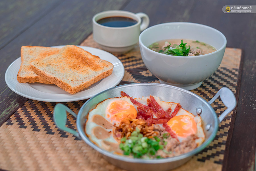 เช้านี้เราตื่นมารับประทานอาหารของที่พักที่ได้จัดเตรียมไว้ในแบบเซ็ตเมนูเสิร์ฟเป็นข้าวต้มหมู ไข่กระทะ และยังมีกาแฟ ชา ผลไม้ตามฤดูกาลให้เราได้อิ่มอร่อยกันต่อ