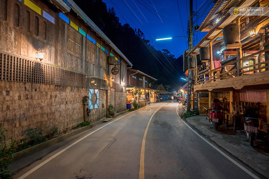 หรือถ้าใครอยากออกไปชิลล์เอ้าท์ สัมผัสบรรยากาศช่วงค่ำในหมู่บ้านแม่กำปองก็เดินไม่ถึง 5 นาที ก็ถึงกลางหมู่บ้านแล้ว ซึ่งช่วงค่ำร้านอาหารต่างๆ จะทยอยปิด แต่ก็ยังมีบ้างร้านที่ยังเปิดให้บริการอาหารช่วงเย็น บรรยากาศช่วงค่ำที่นี่จึงค่อนข้างเงียบสงบทีเดียว
