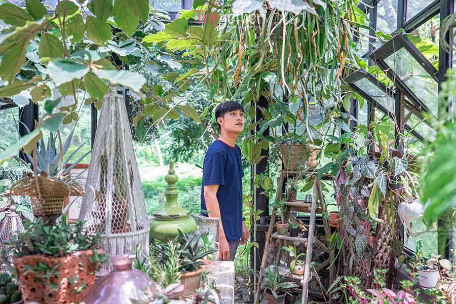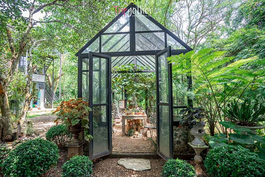 ส่วนมุมไฮไลท์ที่ไม่ว่าใครก็ต้องตกหลุมรักก็คือ บ้านเรือนกระจกสีดำสุดเท่ ที่ด้านในเป็นโรงเรือนต้นไม้สุดคิวท์