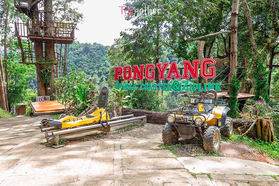 จากคาเฟ่เราตะเวนรถต่ออีกไม่เกิน 5 นาที จะพบกับแหล่งท่องเที่ยวสไตล์แอดเวนเจอร์ Pongyang Zipline & Jungle Coaster ที่มีเครื่องเล่นชวนหวาดเสียวให้หัวใจได้เต้นแรงมากมาย ที่สำคัญยังมีคาเฟ่และรีสอร์ทอีกให้บริการ เป็นอีกจุดที่น่าสนใจครบแบบวันสตอปเซอร์วิส