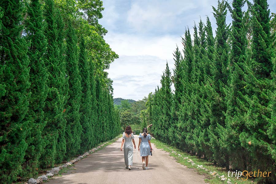 ภายในฟาร์มมีพื้นที่กว้างและบรรยากาศร่มรื่นมาก มุมต้นสนตรงนี้ฟีลเหมือนต่างประเทศจริงๆ