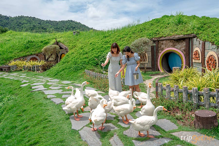 และในที่สุดก็มาถึงไฮไลท์ของเรา นั่นก็คือบ้านฮอบบิท ซึ่งบริเวณนั้นมีการจำลองหมู่บ้านฮอบบิทเหมือนหนังเรื่อง The Lord of the Ring บรรยากาศดูน่ารักและมองไปทางไหนก็เจอแต่ความร่มรื่นของต้นไม้ใบหญ้า และมุมนี้ใครมาก็ต้องถ่ายรูปคู่กับฝูงห่านตัวขาวๆ ซึ่งการจะได้รูปสวยๆ นั้นก็ต้องซื้ออาหารมาล่อสะหน่อย ซึ่งค่าอาหารห่านอยู่ที่ 50 บาท หลังจากซื้ออาหารแล้วจะมีพนักงานไปต้อนน้องห่านมา ที่เหลือก็เป็นหน้าที่เราเตรียมกล้องให้พร้อม ให้อาหารน้องไปพลาง ยิ้มมองกล้องไปพลาง รับรองได้รูปสวยๆ กลับไปเพียบ!