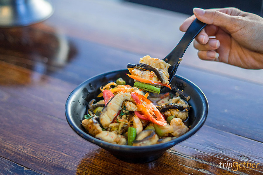 แกงป่าปลาคัง เมนูอาหารพื้นบ้าน รสชาติพริกแกงป่าเข้มข้น เนื้อปลาขาวชิ้นโตๆ น้ำขลุกขลิก ราคา 180 บาท