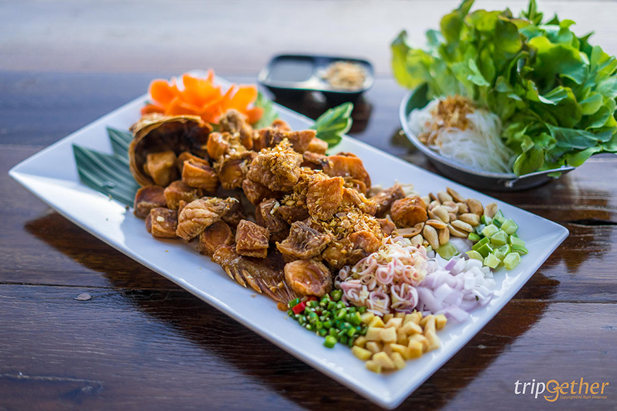 เมี่ยงปลาทับทิม เนื้อปลาหั่นออกมาชิ้นพอดีคำ ห่อใส่ใบชะพลู ราดน้ำจิ้มสูตรเด็ด กินคู่กับเครื่องเคียง ราคา 295 บาท