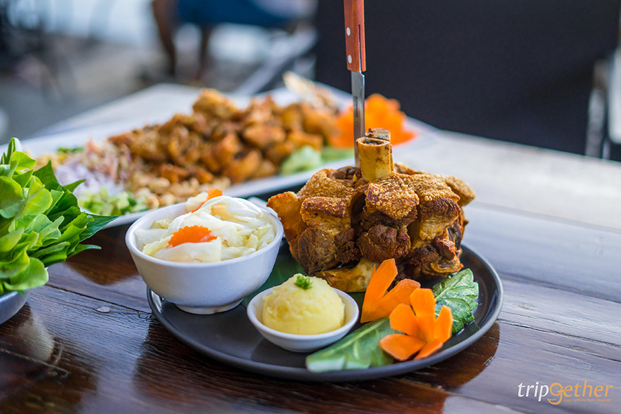 เริ่มจากขาหมูทอดกรอบ ราคา 395 บาท ขาหมูกรอบๆ เนื้อนุ่มฉ่ำๆ กินคู่กับน้ำจิ้ม บอกเลยว่าอร่อยฟินมาก