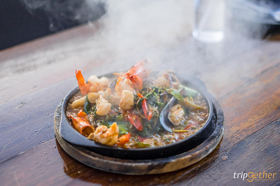 ผัดฉ่ากระทะร้อนทะเล หอมเครื่องสมุนไพรและพริก รสชาติจัดจ้าน แถมเนื้อกุ้ง ปลาหมึก หอยก็กินได้เต็มคำเลย ราคาเพียง 250 บาท