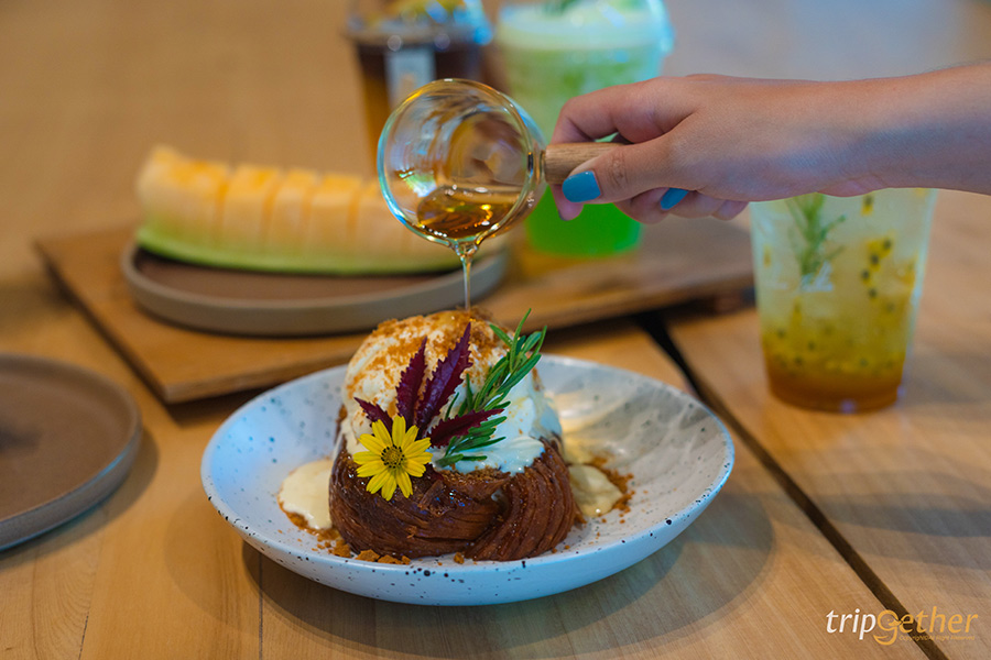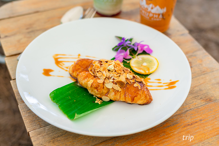เดินถ่ายรูปกันเสร็จแล้วก็มาสั่งของกินกันหน่อย โดยคาเฟ่ที่นี่มีเครื่องดื่มให้เลือกเยอะแยะ ไม่ว่าจะเป็นชาเย็น และสตรอเบอร์รี่นมสดมัทฉะส่วนเมนูที่เป็นเบเกอรีก็จะมีเพียงอย่างเดียวคือครัวซองต์ ซึ่งต้องบอกเลยว่าครัวซองต์ของที่นี่จะมีกลิ่นหอมๆ ของเนย ข้างนอกกรอบ ข้างในนุ่มๆ แถมชิ้นก็ใหญ่กำลังดี โรยด้วยอัลมอนด์แบบจัดเต็มและราดด้วยคาราเมลเยิ้มๆ