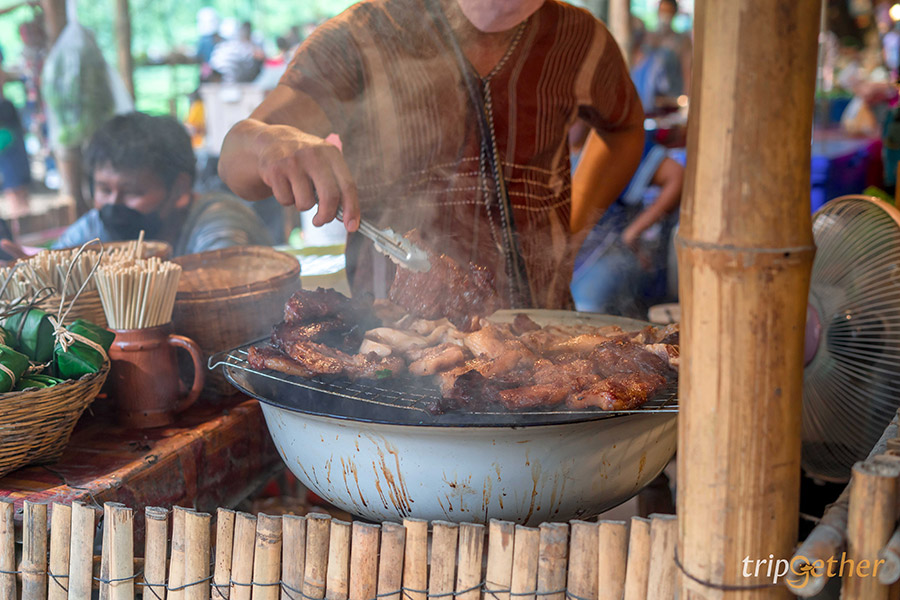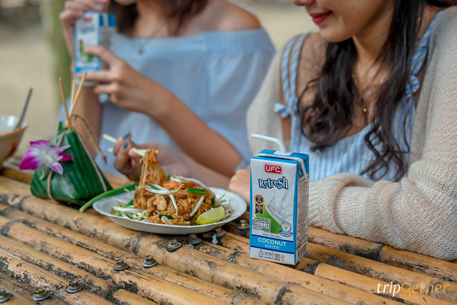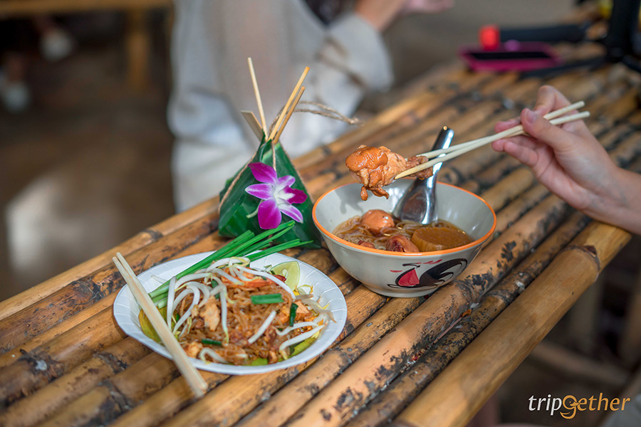 ตักบาตรเสร็จก็ได้เวลาเดินหาของกินสำหรับมื้อเช้า โดยเราก็เลือกหาอะไรกินง่ายๆ จากในตลาดนี้เลย บอกเลยว่าตลาดของกินเยอะและหลากหลายมาก อยากกินแบบอาหารจานเดียว ของกินเล่น หรือขนมก็มีหมด ในมื้อเช้านี้เราก็จัดเต็มด้วยผัดไทยราคา 30 บาท ก๋วยเตี๋ยวไก่มะระราคา 35 บาท และข้าวเหนียวหมูปิ้งราคา 30 บาท บอกเลยว่าแต่ละร้านอร่อยและราคาสบายกระเป๋าสุดๆ
