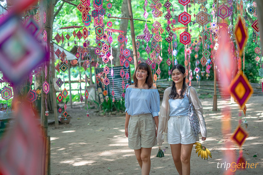 ภายในตลาดมีการตกแต่งด้วย “คังด้ง” สีสันสดใส ซึ่งคำว่าคังด้งเป็นภาษากะเหรี่ยง แปลว่า ใยแมงมุม เป็นสัญลักษณ์แสดงความกลมเกลียว นอกจากความหมายจะดีแล้วยังดูสวยมากๆ จนต้องกดถ่ายรูปสักหน่อย