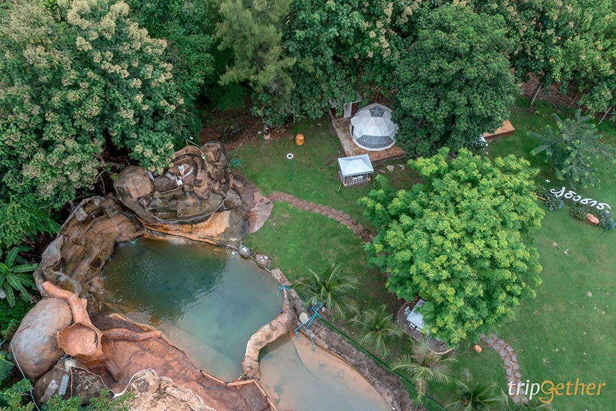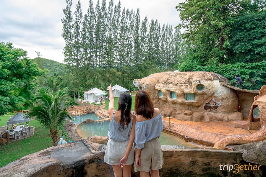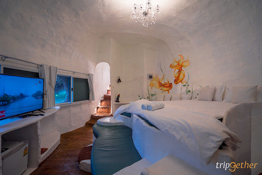 ห้องพักของที่นี่มีหลายแบบด้วยกัน ไม่ว่าจะเป็นบ้านคนแคระ เต็นท์โดม บ้านถ้ำ แต่สำหรับคืนนี้เราเลือกพักสบายๆ ใน บ้านภูนับดาว ซึ่งเป็นบ้านถ้ำใต้น้ำตก นอนชิลล์ๆ มองออกไปนอกหน้าต่างเห็นน้ำตกเป็นสายไหลผ่านและได้ยินเสียงน้ำตลอด ให้ฟีลเหมือนอยู่ถ้ำใต้น้ำตกจริงๆ ส่วนในห้องพักก็จำลองออกมาเหมือนถ้ำ เน้นใช้โทนสีขาวดูสบายตาน่านอน ห้องกว้างขวางมีเตียงนอน 2 หลังใหญ่และมีห้องน้ำส่วนตัวในห้อง ส่วนสิ่งอำนวยความสะดวกก็มีครบครัน เรียกได้ว่าเหมาะกับการมานอนหลังจากเดินทางมาทั้งวันมาก เห็นห้องสวยๆ และอยู่สบายแบบนี้ ราคาเพียง 2,500 บาทเท่านั้น