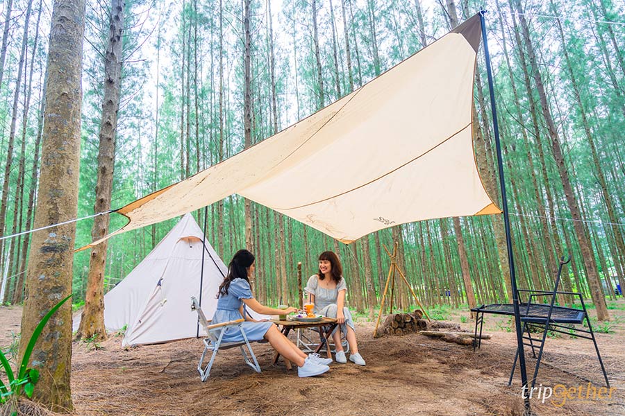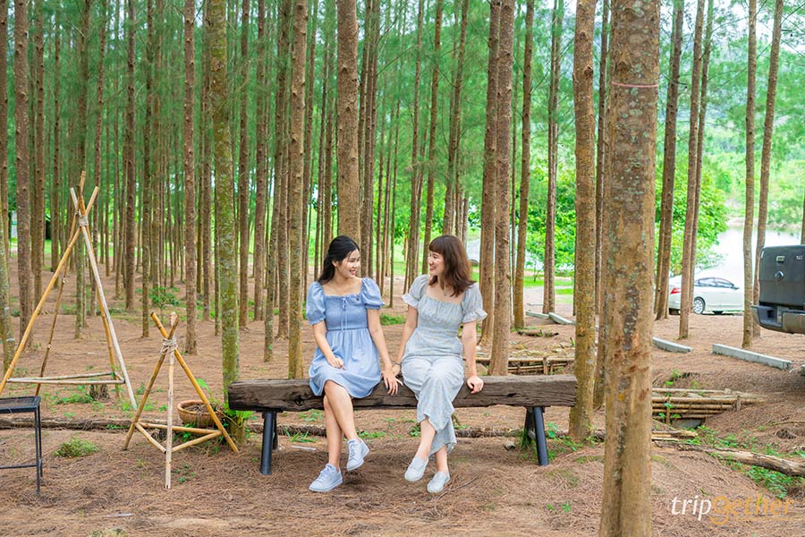 มุมถ่ายรูปในร้านเยอะมาก เริ่มจากจุดแรกบริเวณริมอ่างเก็บน้ำ บอกเลยว่ามุมนี้บรรยากาศดีจริง ธรรมชาติอุดมสมบูรณ์สุดๆ แถมถ่ายรูปออกมาสวยปังมาก แทบจะนึกว่าอยู่ต่างประเทศ และถัดมาที่เป็นไฮไลท์ก็คือโซนต้นสน ซึ่งโดยปกติป่าสนแบบนี้จะเจอในแถบภาคเหนือ แต่ที่นี่แค่ราชบุรีเอง ขับรถมาแปปเดียวก็ได้รูปคู่ป่าสนสวยๆ แล้ว นอกจากนี้ในร้านยังมีพร็อพสไตล์แคมป์ปิ้ง อย่างเต็นท์ โต๊ะ เก้าอี้ ชุดเครื่องครัวสนาม แคมป์กองไฟ เรียกได้ว่าเอาใจคนชอบแคมป์ปิ้งมาก