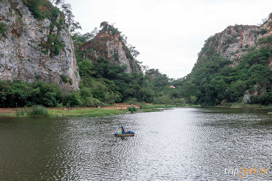 และในที่สุดก็มาถึง อุทยานหินเขางู เพียงเดินเข้ามาในส่วนของอุทยานก็สัมผัสได้ถึงลมเย็นสบายๆ และความสวยงามของภูเขาหินปูน บรรยากาศที่นี่ชิลล์และสบายมากๆ มีสระน้ำอยู่หน้าภูเขาหินขนาดใหญ่ ถ่ายรูปออกมาดูอลังการมาก นอกจากนี้ยังมีสะพานข้ามน้ำที่จะพาเราไปยังทางเดินกลางขุนเขา ซึ่งทางเดินก็ง่ายๆ เหมาะกับการมาเดินเล่น เสพธรรมชาติสุดๆ รวมถึงยังมีกิจกรรมให้ทำอย่างปั่นเรือและให้อาหารปลาด้วย