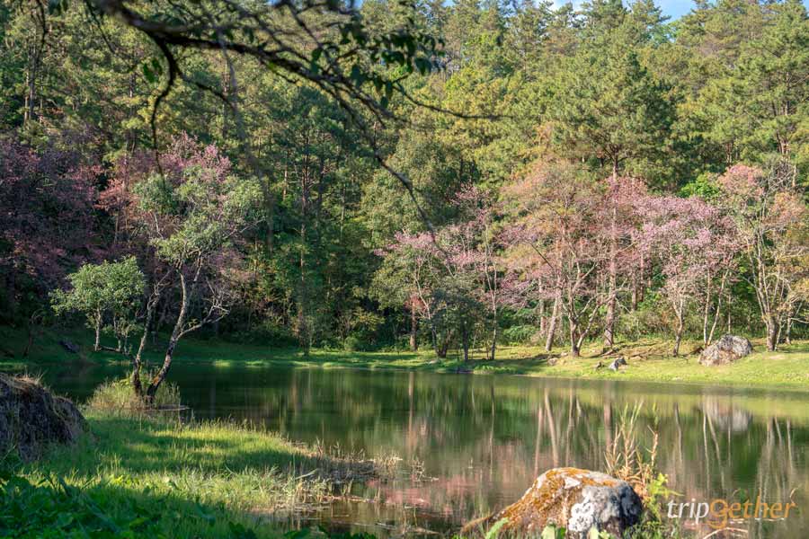 จุดเด่นของที่นี่มีวิวทิวทัศน์ต้นสนสลับกับต้นพญาเสือโคร่ง และสระน้ำใหญ่ใจกลางอุทยานฯสะท้อนเงาดอกซากุระ เหมือนศิลปะภาพวาดของญี่ปุ่น ให้ความรู้สึกเหมือนไปเที่ยวต่างประเทศเหมาะแก่การนั่งปิกนิกกับเพื่อน อากาศเย็นสบายลมพัดผ่าน บรรยากาศเงียบสงบ โอบล้อมไปด้วยซากุระบานเต็มที่ ถือเป็นช่วงเวลาที่ดีที่สุดในปีนี้กันเลยทีเดียว
