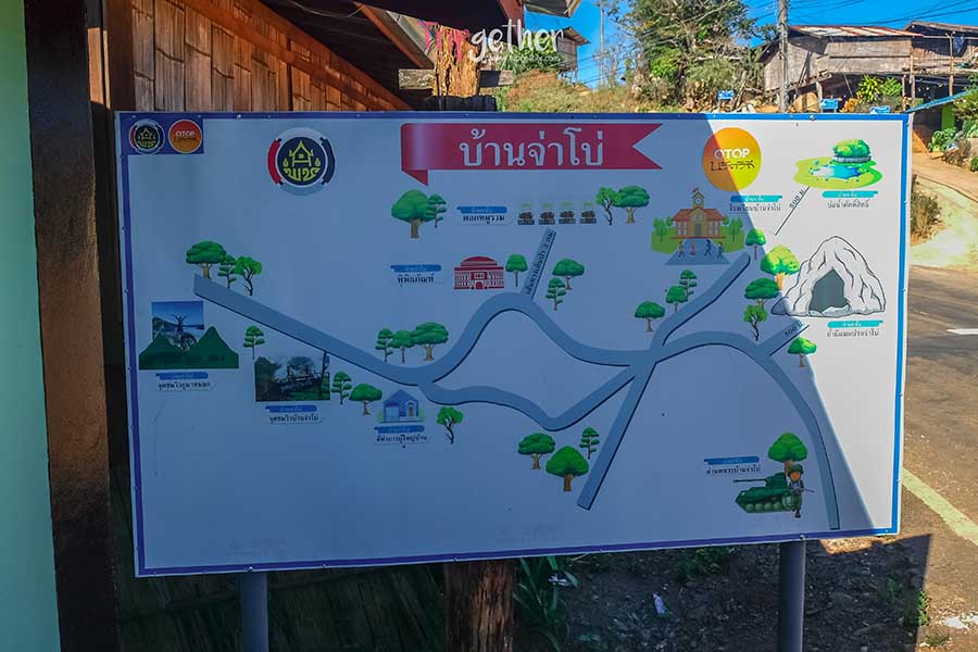 บ้านจ่าโบ่ เป็นหมู่บ้านเล็กๆ กลางเขาที่มีชาวเขาเผ่าลาหู่อาศัยอยู่ ซึ่งคำว่าจาโบ่ นั้นก็มีที่มาจากชายผู้เป็นคนก่อตั้งหมู่บ้านนั่นเอง บรรยากาศภายในยังคงความเรียบง่าย มีบ้านรูปทรงแบบเดิม คงวีถีชีวิตได้อย่างเป็นเอกลักษณ์