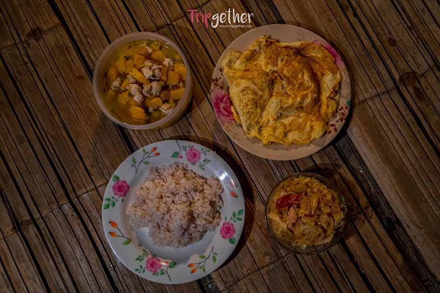 เดินเสร็จเข้าช่วงเย็นพอดี เราขอพักผ่อนเข้าที่พัก ทานมื้อเย็นกับแบบเรียบง่าย สำหรับเมนูเย็นนี้ประกอบไปด้วย ต้มฟักทอง ผัดวุ้นเส้น และไข่เจียว เสริฟพร้อมข้าวดอย ที่มีความเหนียวนิดๆ แปลกใหม่ดีทีเดียว