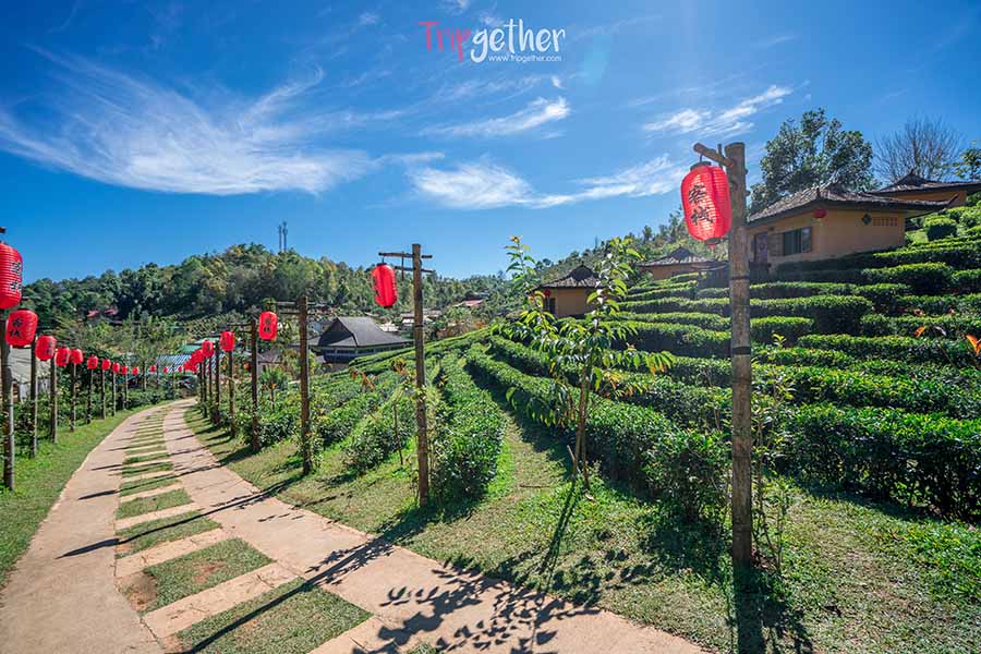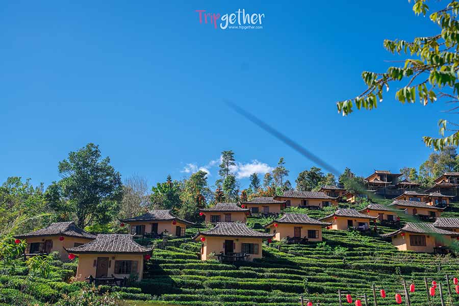 สำหรับทริปนี้เราไม่ได้พักที่บ้านรักไทย แต่ก็มีรีสอร์ทหนึ่งกลางไร่ ที่ต้อนรับให้นักท่องเที่ยวเข้าไปถ่ายไป ลีไวน์รักไทย รีสอร์ท ที่นี่ตั้งอยู่บริเวณทางเข้าหมู่บ้าน ตั้งเด่นกลางไร่ชาสีเขียว ตัวที่พักเป็นบ้านดินหลังสวยที่เรียงราย และมีทางเดินโคมสีแดง และโอ่งหมักชาให้ถ่ายรูปกัน
