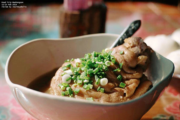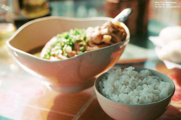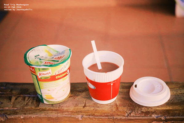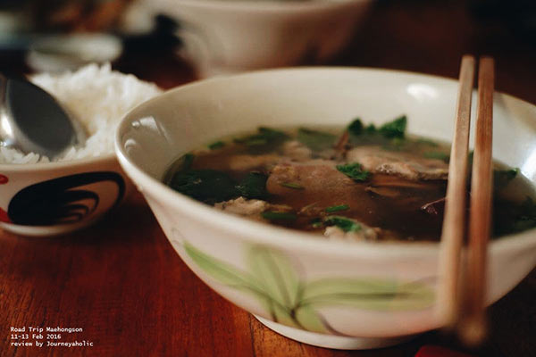 วนอยู่ในปายได้ไม่เท่าไหร่ก็มาจบที่ร้านเกาเหลาเลือดหมูร้านนี้ค่ะ ใส่ใบอะไรซักอย่างที่ไม่ใช่ผักกาดหอม แล้วก็ไม่ใช่ใบตำลึง รสชาติแปลกๆ สันนิษฐานว่า น่าจะเป็นใบสรอเบอรี่ค่ะ เลยร้านข้าวมาหน่อยเป็นร้านขายเสื้อมือสองค่ะ รีบตรงเข้าไปหาเสื้อกันลมซักตัว สภาพพอใช้ได้ ได้มาในราคา 200 บาท ถ้าไม่ได้ตัวนี้คาดว่าไม่ถึงแม่ฮ่องสอนแน่ค่ะ ถึงเวลาจะเที่ยงแล้ว แต่อากาศก็ไม่ได้ลดละความเย็นลงแม้แต่น้อย เห็นฝรั่งเค้าใส่เสื้อสายเดี่ยวแว๊นกันสบายใจ จิตใจเค้าทำด้วยอะไรกันค่ะ ฮ่าๆๆ เมื่อชุดพร้อม ร่างกายพร้อม ออกเดินทางกันต่อ มุ่งหน้าไปทาง อ.ปางมะผ้าค่ะ