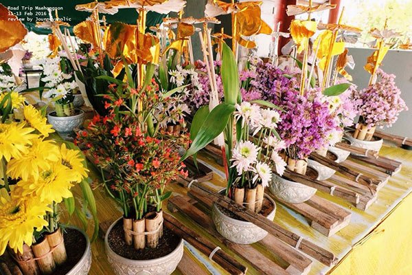 บางคนอาจจะแปลกใจว่าทำไมที่กระถางดอกไม้บูชาเค้าถึงมีไม้มาให้ นั่นเป็นเพราะว่า ที่นี่เค้ามีความเชื่อเรื่องการค้ำจุนชีวิต เค้าเลยให้ไม้มาพร้อมกับดอกไม้บูชา ซึ่งเวลาจะบูชา เราก็ต้องนำดอกไม้ไปวางไว้ตรงฐานของพระธาตุ ซึ่งจะมีพระประจำวันเกิดทั้งเจ็ดวันอยู่ พร้อมทั้งเอาไม้ไปวางไว้ตรงนั้นด้วยเพื่อเป็นการค้ำชูชีวิต