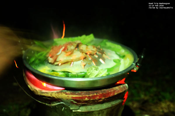 อาบน้ำแล้ว ฟ้าก็มืดแล้ว ก็หิวแล้วสิ่คะ เมนูเด็ดของที่นี่ ก็น่าจะเป็นหมูกะทะ นี่แหละค่ะ เด็ดรึปล่าวไม่รู้ รู้แต่ว่าบรรยากาศมันเด็ดค่ะ แล้วมันก็เป็นหมูกะทะที่อร่อยที่สุดเท่าที่เราเคยกินมาเลยก็ว่าได้ นั่งบนดิน ตามองดาว ปากเคี้ยวหมูกะทะ กับอากาศแบบนี้ อุณหภูมิแบบนี้ ฟินจริงๆ ต้องไปลองค่ะ