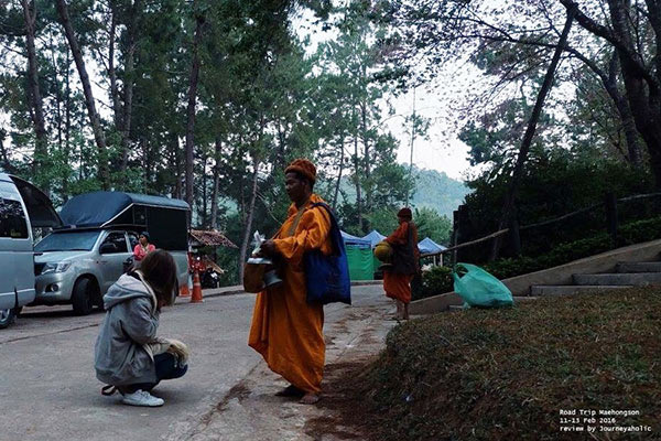 ตอนเช้าๆที่นี่จะมีพระจากในหมู่บ้านเข้ามาบิณฑบาตรนะคะ ก็จะมีชาวบ้านบางส่วนเอาของใส่บาตรเป็นชุดๆเดินมาขายให้ถึงเต๊นท์เลยค่ะ ชุดใส่บาตร ชุดละ 40 บาท พระท่านจะมารอบิณฑบาตรอยู่บริเวณแถวๆที่จอดรถค่ะ จะมาตั้งแต่ประมาณหกโมงเช้า