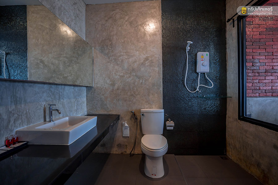 ห้องน้ำที่นี่ก็เน้นโทนสีดำ พร้อมกระจกใสบานใหญ่ให้อาบน้ำไปดูทีวีไปก็ได้ บ้านรินรักษ์ รีสอร์ท โทร. 080 096 2828