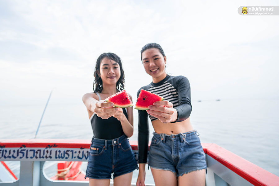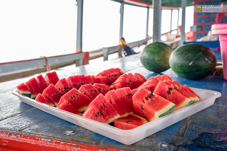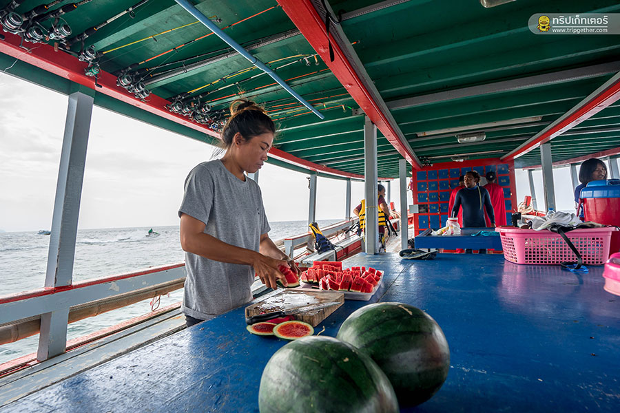 หลังจากที่ได้ไปดำน้ำดูปะการังและเล่นเครื่องเล่นกันจนหนำใจแล้ว ขึ้นมาบนเรือพี่ๆ เขาก็เตรียมแตงโมเย็นๆ หวานฉ่ำไว้ให้เราได้กินกันด้วย