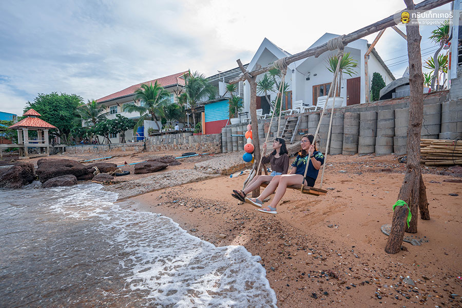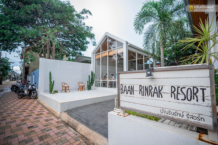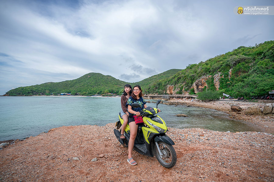 นั่งเรือข้ามฟากกันมาประมาณ 45 นาที เรือก็เข้าเทียบท่าที่ท่าเรือหน้าบ้าน เกาะล้านแล้ว เย้! และการจะเที่ยวบนเกาะได้แบบชิลล์ๆ ไร้กังวลเราจึงทำการเช่ารถมอเตอร์ไซค์ค่ะ ค่าเช่ารถที่นี่วันละ 400 บาทเท่านั้น!! แค่นี้เราก็สามารถขับรถเที่ยวทัวร์ได้ทั่วเกาะเลยค่ะ เมื่อได้รถมาแล้วเราก็มุ่งหน้าไปยังที่พักในคืนนี้กันเลย แต่เรามาถึงกันก่อนเวลาเช็คอินค่ะ เราจึงพากันมานั่งเล่นที่ รินรักษ์คาเฟ่ (Rinrak Cafe) (ร้านเปิดทุกวันเวลา 8.00-19.00 น.) เป็นคาเฟ่ชิคๆ สีขาวตกแต่งสไตล์มินิมอล รายล้อมไปด้วยกระบองเพชร ซึ่งตั้งอยู่ตรงข้าม บ้านรินรักษ์ รีสอร์ท (Baan Rinrak Resort) ที่พักของเราในคืนนี้ค่ะ