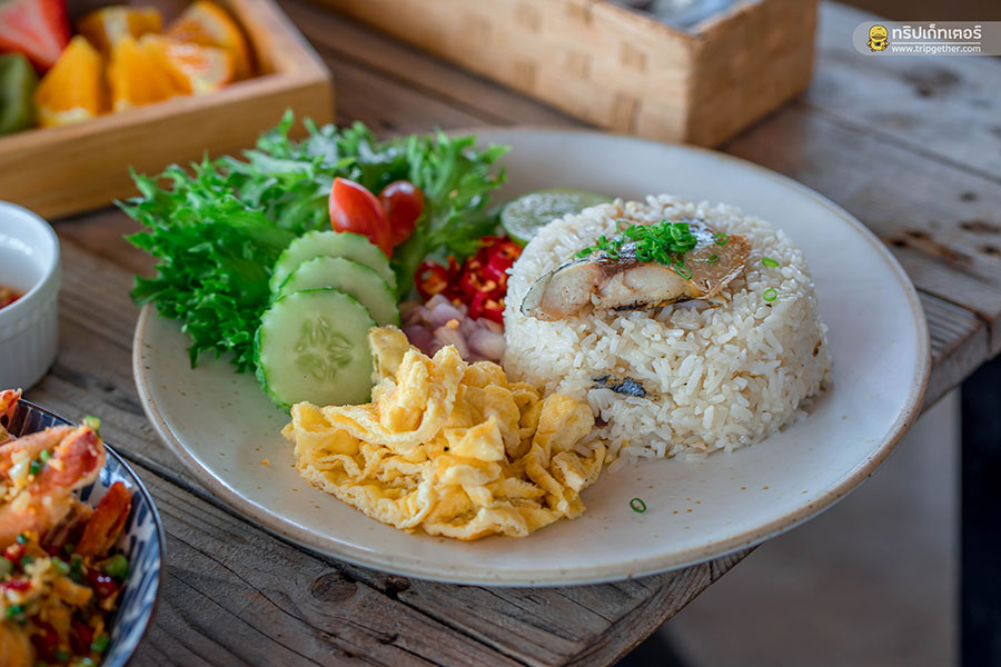 ต่อด้วย ข้าวขยุ้มปลาทู & ไข่เจียว ที่คลุกเคล้าเนื้อปลาทูกับข้าว เสิร์ฟคู่กับไข่เจียว มีพริกสดและหอมแดงเป็นเครื่องเคียง
