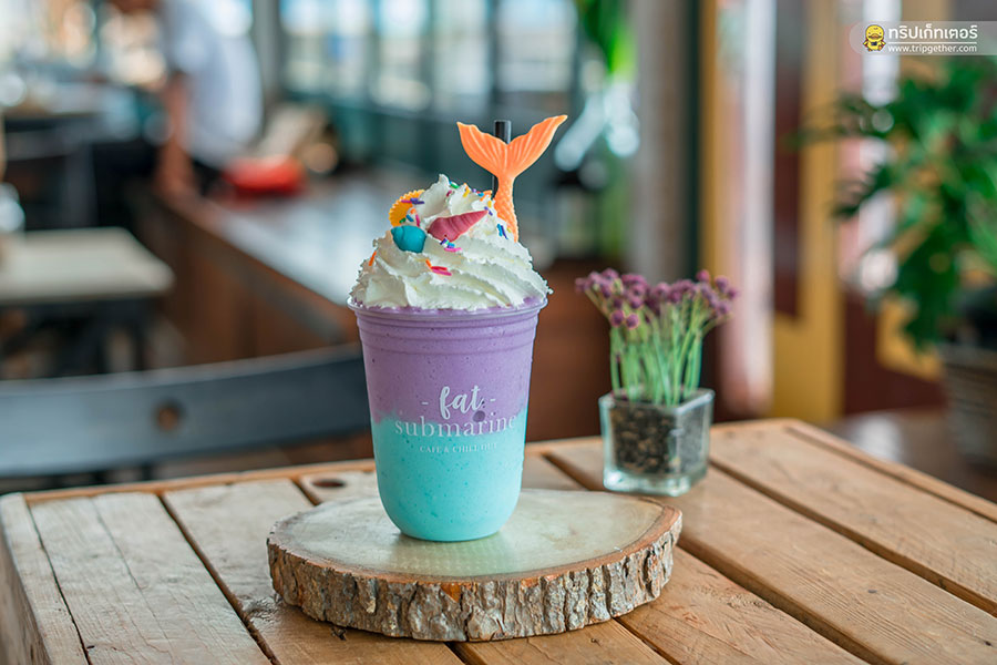 และหากใครมาถึงเรือดำน้ำแห่งนี้แล้ว จะต้องสั่งเมนูสุดละมุนสีพาสเทลยอดฮิตของร้านอย่าง Under The Sea Mermaid Milk สีหวานมุ้งมิ้ง ฟรุ้งฟริ้งสุดๆ