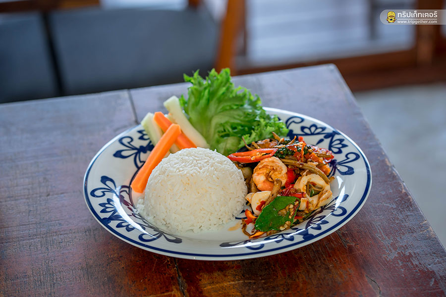 ต่อด้วย ข้าวผัดฉ่าทะเล เป็นอาหารไทยพื้นบ้านหนักเครื่องมี กุ้ง หอย หมึกครบผัดกับพริกแกงหอมๆ กินกับข้าวสวยร้อนๆ คือดี บอกเลย