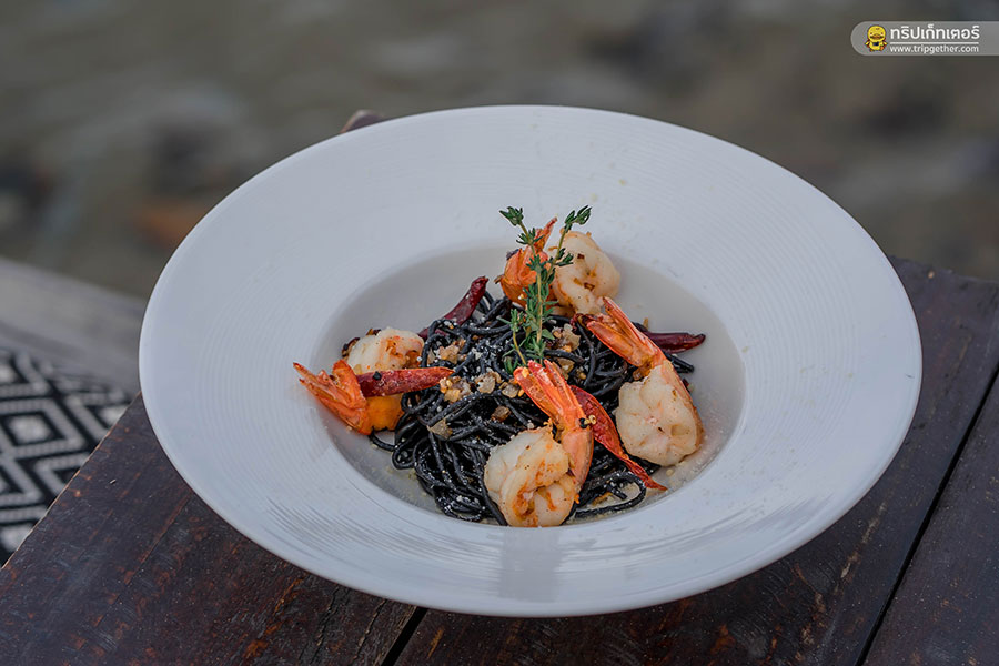 เมนูแรกที่ขอนำเสนอเลยคือ สปาเก็ตตี้ผัดพริกแห้งกุ้งสด เป็นสปาเก็ตตี้เส้นหมึกดำ ผัดคลุกเคล้ากับพริกแห้ง ใส่กุ้งสดๆ แบบจัดเต็ม