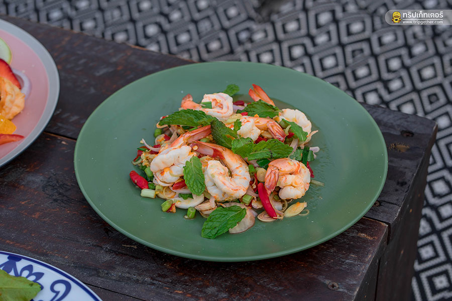ปิดท้ายด้วย ยำกุ้งตะไคร้ รสชาติเผ็ดเปรี้ยวหวานลงตัว กุ้งสดเต็มคำ จับคู่มากับ น้ำเสาวรสปั่น เปรี้ยวหวาน สดชื่นดีทีเดียว