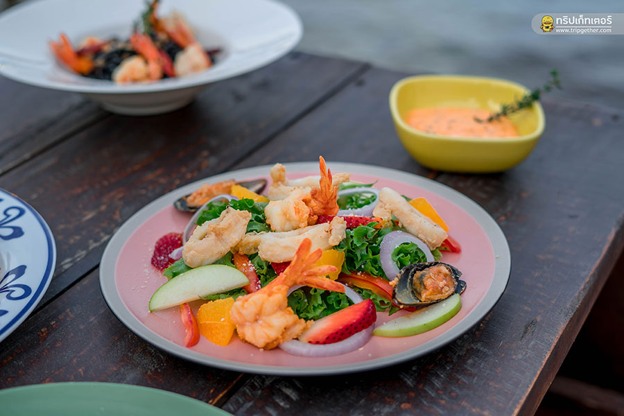 มาหารักสลัด เป็นสลัดผัก ผลไม้ จัดเต็มทั้งกุ้ง ทั้งหมึก ราดด้วยน้ำสลัดเทาส์ซันไอแลนด์ จับคู่มากับ พีชที ชาพีชกลิ่นหอมละมุน