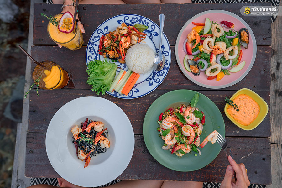 ก่อนหน้านี้เหนื่อยและหิวพอสมควร สั่งอาหารมากินกันทั้งหมด 4 อย่าง ในเมื่อมาเที่ยวทะเลทั้งทีต้องเน้นกุ้ง เน้นปลาหมึกสิคะ อาหารของที่นี่เป็นสไตล์ฟิวชั่น ทำสดใหม่ทุกเมนู