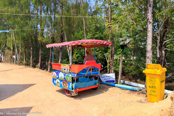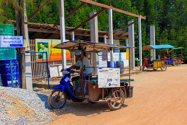 แล้วเราก็ต้องนั่งรถที่เค้าจัดไว้ให้ เสียค่ารถคนละ 5 บาท ระยะทางจากจุดจอดรถไปทางเข้าทุ่งโปรงทองประมาณ 1 กิโลเมตรครับ ลานจอดรถที่นี่จะมีอยู๋ประมาณ 2-3 ลาน ลานสุดท้ายลึกเข้าไปจะเป็นลานที่ใกล้ทางเข้ามากที่สุด แล้วแต่สะดวกเลยครับว่าจะจอดรถที่ลานไหน รถที่เราต้องนั่งต่อเข้าไปครับ และนี่คือรถที่เรานั่งกันไปครับซึ่งก็รู้สึกแปลกไปอีกแบบ เรานั่งรถกันมาไม่ถึง 5 นาทีก็ถึงกับทางเข้าทุ่งโปรงทองครับ