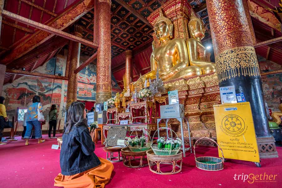 แอบบอกว่านอกจากเราจะชมภาพในตำนานนี้แล้ว ในวิหารยังมีพระประธานที่หันหน้าพระพักตร์ไปทั้ง 4 ทิศ เมื่อเพื่อนๆ ขอพรให้อธิฐานให้ครบทุกทิศ จะถือว่ามาถึงน่านอย่างแท้จริงและเสริมสิริมงคลในชีวิตอีกด้วย