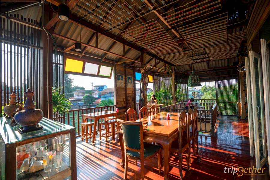 และยังมีโซนห้องอาหาร ที่เปิดโล่งพร้อมรับลมเย็นจากภายนอก วัสดุเป็นไม้เก่าล้วนๆ โซนนี้ประทับใจมากค่ะ เหมือนนั่งกินอาหารบ้านตากับยายสมัยก่อน