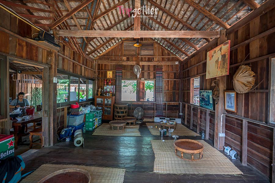 บรรยากาศภายในร้านเป็นบ้านเก่าที่รีโนเวทให้กลายเป็นร้านอาหาร แบ่งออกเป็นโซนนั่งโต๊ะ และโซนนั่งพื้นกินขันโตกสไตล์ชาวเมืองล้านนา