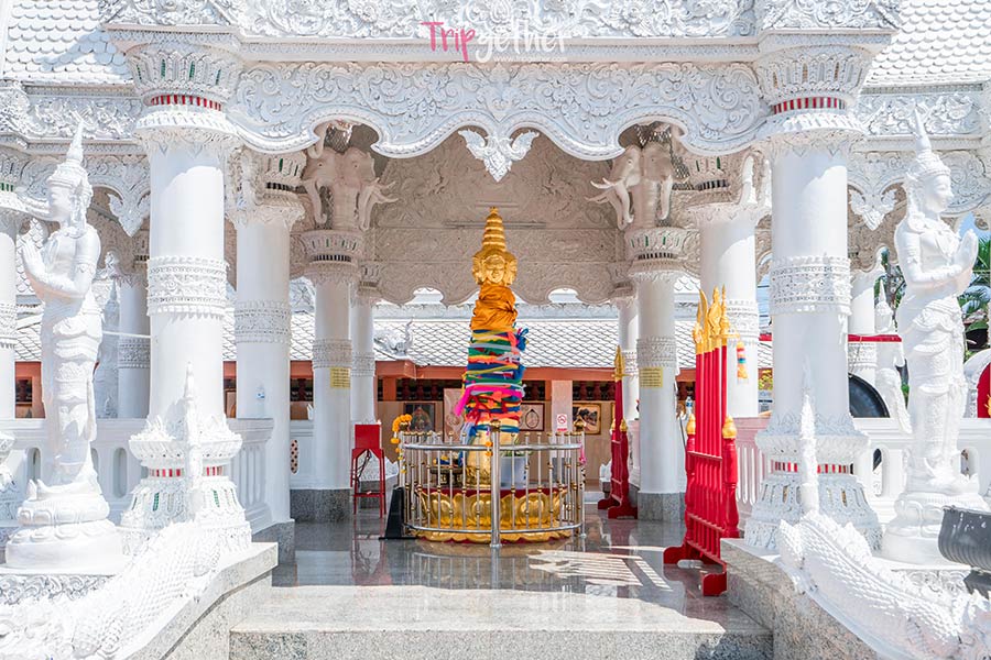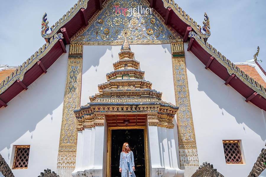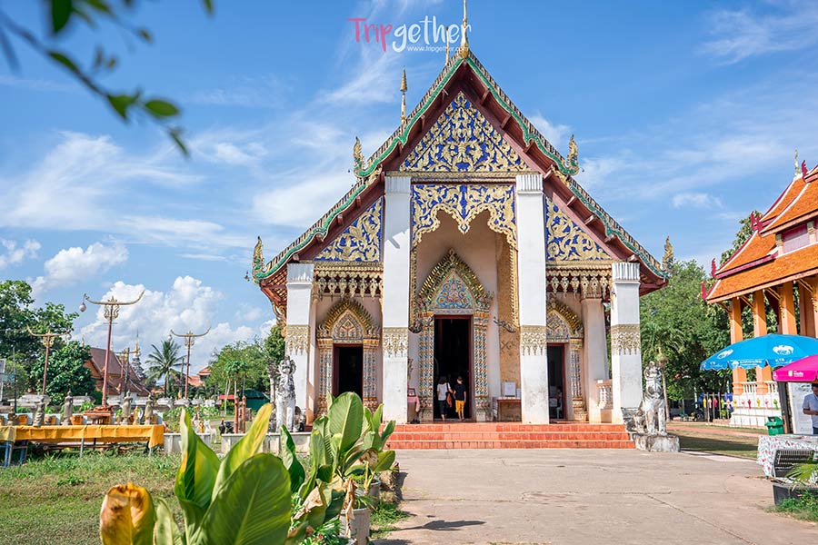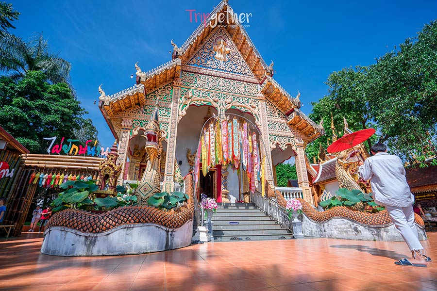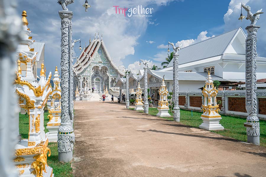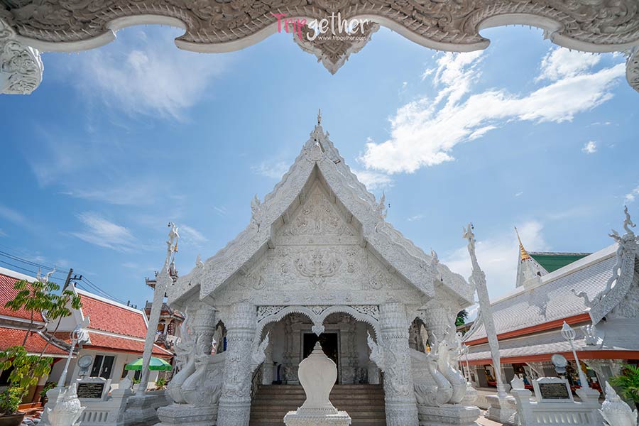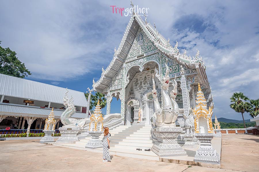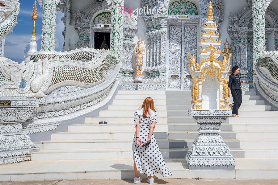 จากนาอินคาเฟ่ เราเดินทางกันต่อเพื่อไปยังจุดเช็คอินแรกของทริปนี้กันที่ วัดบ่อแก้ว วัดสีขาวสุดงดงาม โดดเด่นด้วยศิลปะล้านนา ตกแต่งด้วยลวดลายที่อ่อนช้อย บริเวณรอบๆ วัดล้อมรอบด้วยทุ่งนาสีเขียว