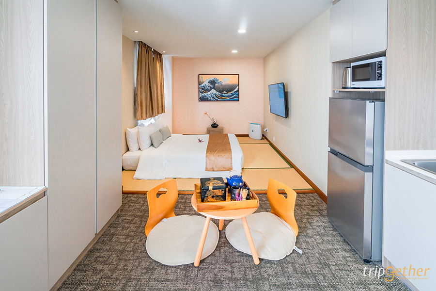 และในที่สุดก็มาถึงห้องพักกันแล้ว ทริปนี้เราจองห้องพักแบบ Yukata Package เป็นแพ็คเกจที่รวมค่าห้องพัก อาหารเช้า แช่ออนเซ็น ชุดยูกะตะ และ Japanese Afternoon Tea ถือว่าเป็นแพ็คเกจที่คุ้มมาก และมีไฮไลท์เป็นการใส่ชุดยูกะตะมาถ่ายรูปคู่กับเซ็ตขนมญี่ปุ่น บอกเลยว่าคาวาอี้สุดๆ ในส่วนของห้องที่เราเลือกก็คือ Japanese Tatami Room เป็นห้องเสื่อทาทามิที่ฟีลญี่ปุ่นแบบเต็มร้อย อีกทั้งห้องกว้างมาก แบ่งโซนนั่งเล่น โต๊ะทำงาน และที่นอนได้อย่างลงตัว แถมสิ่งอำนวยความสะดวกก็ครบ ไม่ว่าจะเป็นไดร์เป่าผม ตู้เย็น ทีวี หม้อไฟฟ้า ไมโครเวฟ ชุดชงชา